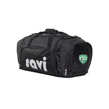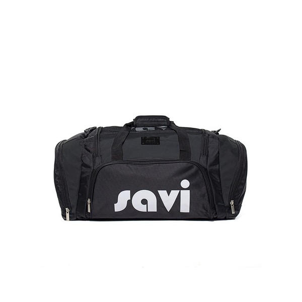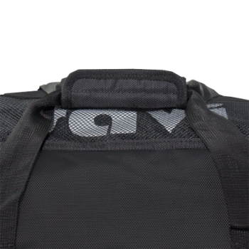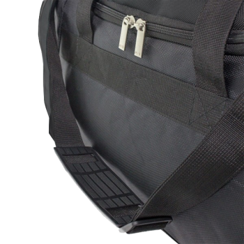 Black nylon bag with robust zippers and shoulder strap.